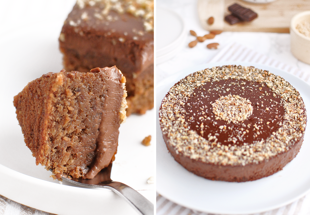 Les mots me manquent pour décrire ce gâteau. La régalade absolue !! Il s’agit d’une recette du chef Karim Bourgi composée d’un fondant aux amandes hachées et au chocolat, surmonté d’une crème cuite au chocolat. Non seulement c’est déliciux, mais c’est aussi super rapide : on cuit d’abord le fondant, puis on rajoute la crème chocolat dessus, on repasse un peu au four, et hop, c’est plié ! Le plus difficile est d’attendre que le gâteau repose afin qu’il fige et ait une consistance optimale pour la dégustation. Le fait d’hacher les amandes au lieu de les utiliser en poudre permet d’apporter de la texture et du goût, surtout si vous les torréfiez au four au préalable (indispensable !). Les photos de cet article illustrent le gâteau à deux stades différents : 1h après cuisson pour la dernière photo à la fin de la recette (la ganache est encore tremblotante et très très onctueuse) et, pour les autres, encore 1h plus tard après un repos au frigo (la ganache est cette fois fondante mais bien figée).